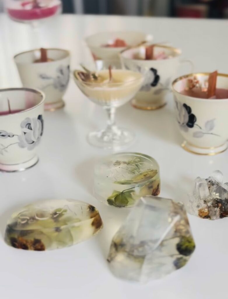 kristall-seifen und tassen-kerzen